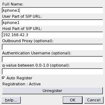 Figure 2. When first running KPhone for a new user, enter the information for the Asterisk server.