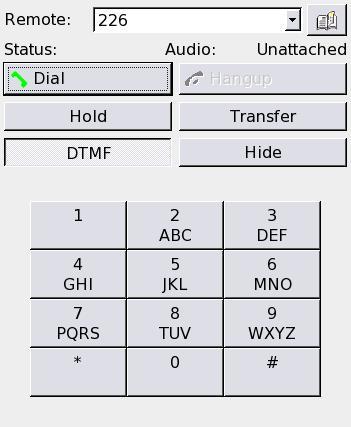 The user then can select the KPhone menu item and launch KPhone (Figure 1). The first time the application is run, the user has to select File→Identity to open the Identity dialog (Figure 2) and enter the connection information. The data to enter here must match that information for the SIP accounts on the VoIP server (Asterisk in our case). Because KPhone stores its configuration in the user's home directory, it need be configured only the first time the user starts KPhone. Because /home is NFS-mounted from the server, the station where users log in is their phone, so the phone effectively follows them if they should change workstations. Once users have registered with the server, they can make calls from the call dialog and DTMF panel (Figure 3).
