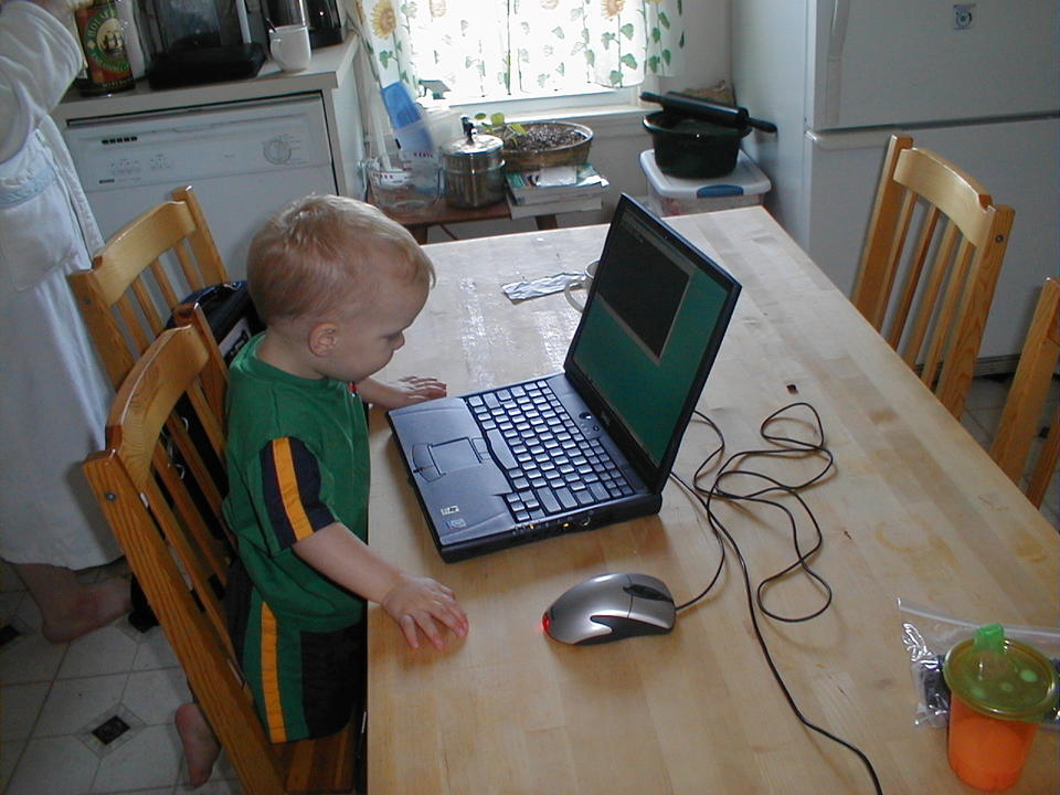 My daughter (2.2-years old) made the transition. She was introduced to Potato Guy and Tux Paint on my Linux box. On this day, she learned everything she needed to know about the mouse operations. A very proud moment for me, she is on road to becoming a geek just like her daddy. Elizabeth Su WOHID Certified (Wireless Optical Human Interface Device), T-shirt awarded shortly after. You can't start them too young. This is only the beginning for them. I am just happy to be there.