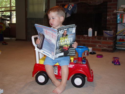 Here's a photo of my son Merit (about 26-months old) sitting on his trusty fire truck checking out my July 2005 issue of LJ. When he was done, he went back into the office and picked up an Advanced C Programming book!