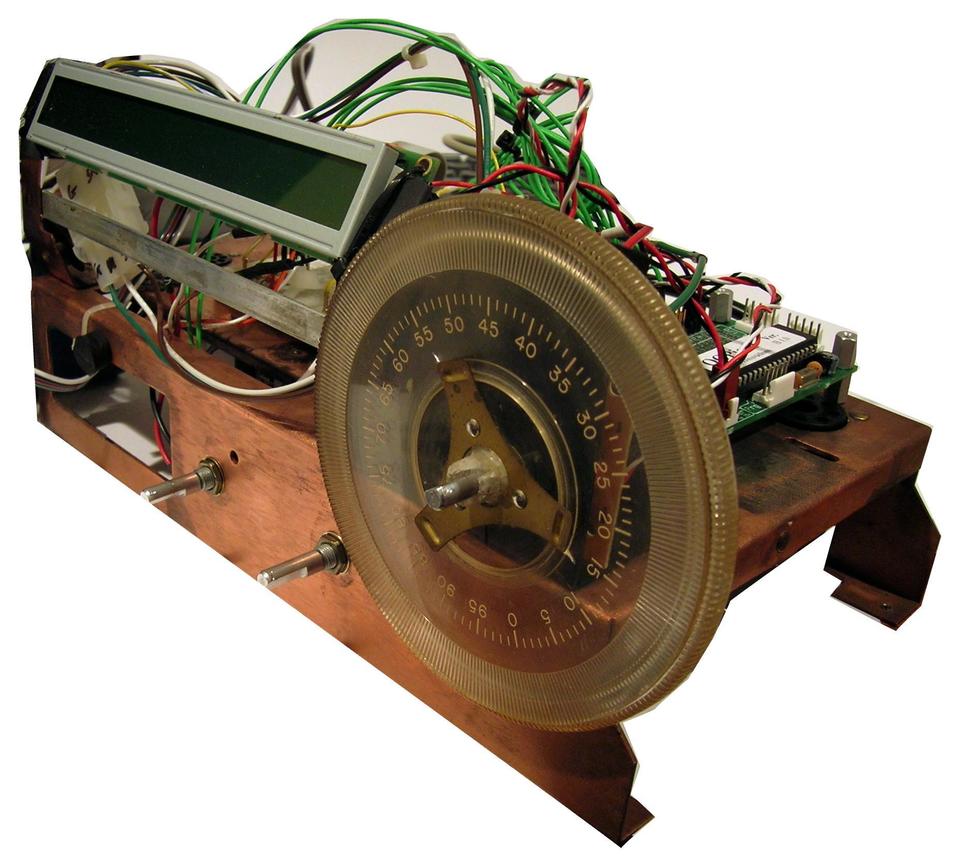 The Radii core hardware platform is an old laptop running Linux. The operator interface consists of two rotary encoders, three momentary contact buttons, a 40x2 backlit LCD, a power supply and a retro radio cabinet. The encoders and buttons are connected to a PIC microcontroller development board that is, in turn, connected to the laptop's serial port. The LCD is connected to the laptop's parallel port.