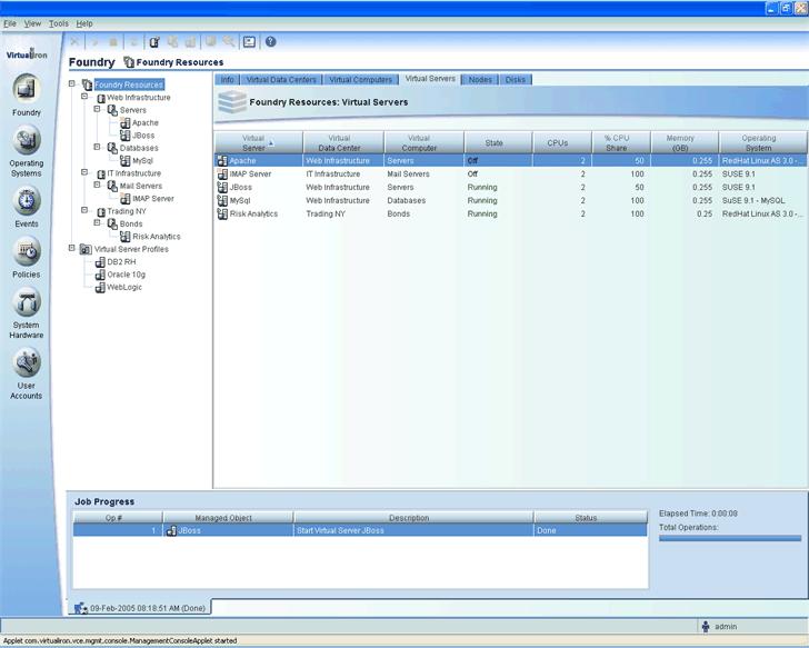 Virtual Iron announced the general availability of its platform, VFe, which allows data centers to create virtual computing platforms that combine virtualization, clustering and provisioning technologies with policy-based system management in an integrated system. Virtual Iron works by seeing available hardware, disk I/O and network I/O devices as resources that can be allocated dynamically based on demand. VFe allows up to ten operating systems to run concurrently on a physical processor, a single operating system to span 16 processors or any combination in between, all sharing the same physical resources. These resources then can be provisioned automatically based on policies, thereby reducing latency and manual intervention. The VFe platform includes data center management capabilities that allow users to apply policy-based management toward provisioning and managing third-party virtual servers, including Xen. To this end, the Xen virtual machine monitor management module is included as a standard part of the Virtual Iron platform.