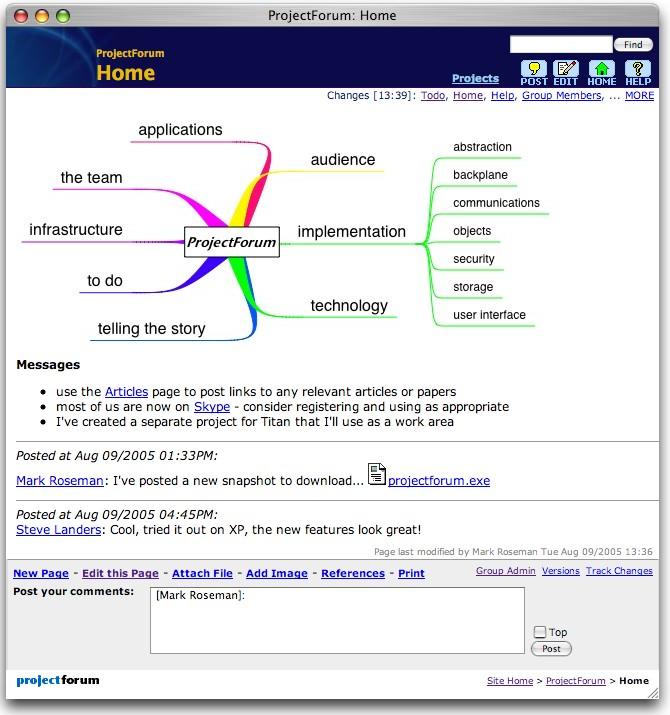 ProjectForum offers shared Web-based work spaces that provide a central place to collect, manage and discuss topics and work relating to a shared project. ProjectForum offers full version control, group project support, multiple authentication options, image and file management, page templates, SSL, full branding support and multiple forums for meeting. ProjectForum is available either as a fully managed hosted service or as software that can be downloaded and run in-house. Versions are available for Windows, Mac OS X, Linux and other UNIXes, while users of the software need only a standard Web browser. New features for version 4.5 include RSS feeds for every page in the forum, which complements the existing per-forum RSS feeds. RSS feeds also can be directly included in ProjectForum pages. Also new is the option to allow forum changes to be broadcast by e-mail.