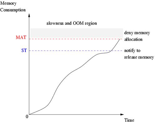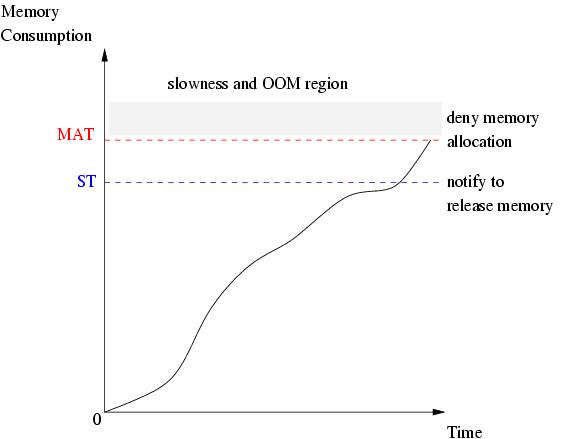 Before memory allocation failure occurs, however, process termination can be performed to release allocated memory. It can be triggered by transmitting the LMS from kernel space to user space to notify applications to free up memory. LMS is dispatched according to ST value. ST should be smaller than MAT, as shown in Figure 1, because the LMS should occur well before memory allocation failure.