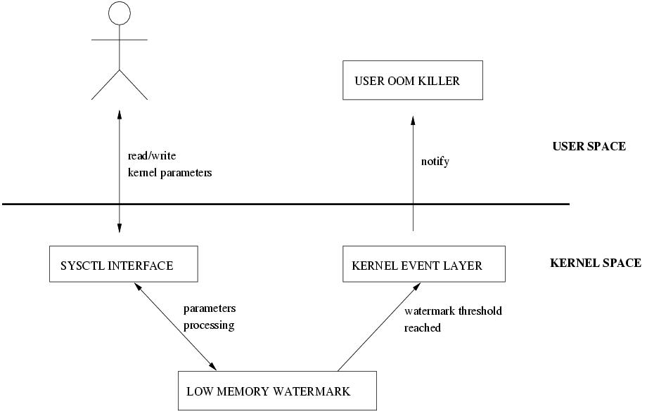 • Low memory signal: Kernel Event Layer signal sent by the kernel to a user-space process terminator, which should employ a process selection algorithm that works based on a specified ST.