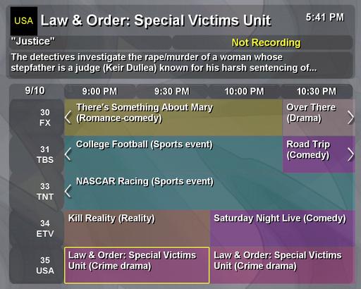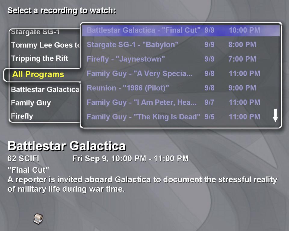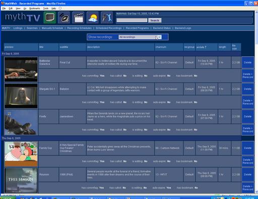 One of the interesting things about MythTV is that it stores everything (except the actual video, of course) in a MySQL database. This makes it easy to import and extract information, and make tweaks. For example, if you need to fine-tune a channel's frequency, you can poke different values into the appropriate database table, go up and down one channel using the remote and see if it made things any better. Of course, it would be really snazzy to be able to tweak the fine-tuning using the GUI; maybe someone will implement that for a future release. It also means that you can run a simple query and see every show you've ever watched, or even write custom software that leverages the two-week program guide data MythTV automatically downloads for you.