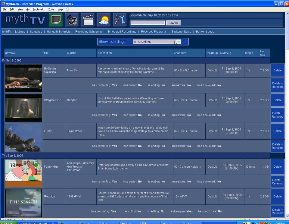 Another option is to install MythWeb, which gives you an Apache-driven Web front end to view your program guide, scheduled recordings and already recorded programs. On Gentoo, this is as simple as typing emerge mythweb.