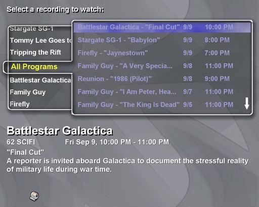 Most users, however, also will want to run mythfrontend, which provides all the PVR user-level functionality through a GUI. In addition to letting the viewer choose what to record and to watch existing programming (as well as live shows), mythfrontend also can display weather data, current news, browse Web pages and even play games through the use of plugins. You can use multiple front ends (conceivably running on different machines), all talking to the same back-end server.