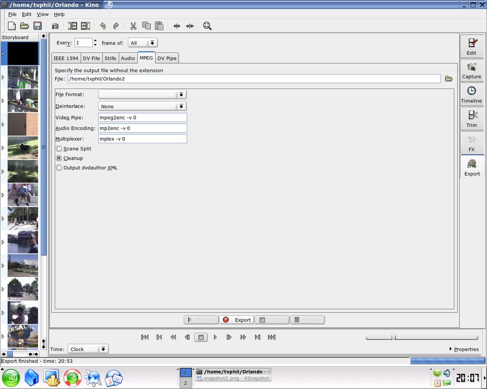 Figure 1. The first step in making a DVD is to export your movie from Kino in MPEG-2 format.