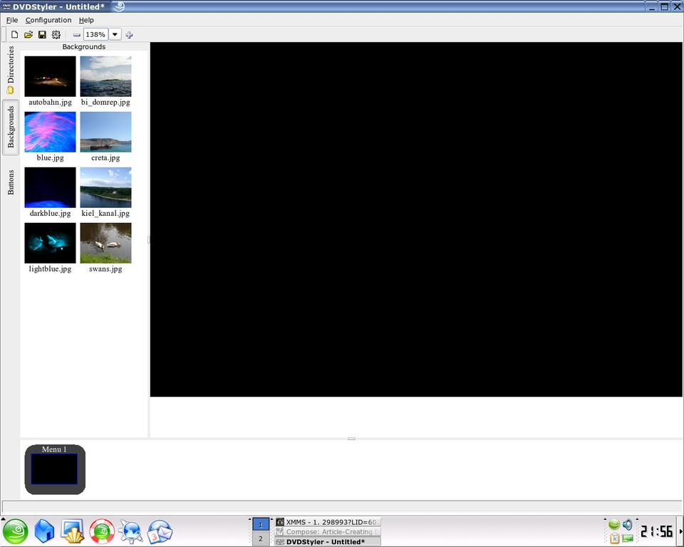 Figure 2. DVDStyler starts with a blank main screen and a selection of menu backgrounds.