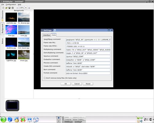 Figure 2 shows what you see when you first click on DVDStyler. Default menu backgrounds are available if you don't have a still picture or a video clip of your own to use (more on this later). First, go to the top of the page and set the configuration of DVDStyler. Click Configuration, then Settings, and choose your language and default format (NTSC for North America, PAL for most other parts of planet Earth).