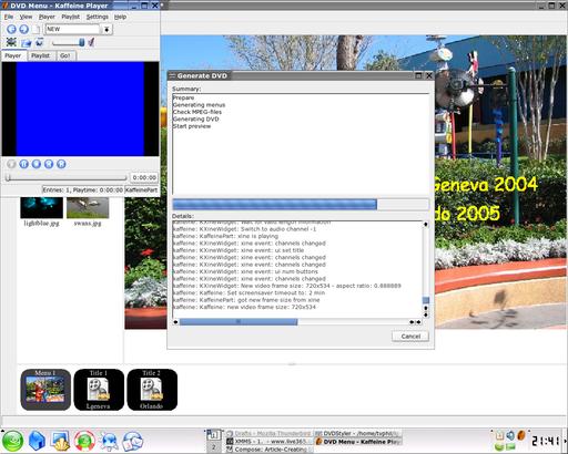 First, you need a few dependencies in place before you install DVDStyler: wxGTK, DVDAuthor, MJPEG Tools, MPEG Toolbox (mpgtx), Xine or Kaffeine (optional, for previewing video) and Totem (optional, for generation of thumbnails). Any of these can be found at your favorite RPM or Debian package resource, like those provided in the on-line Resources for this article. DVDStyler creates only video DVDs. It does not create video on CD, better known as VCD and SVCD. If you don't have a DVD burner, you're unfortunately out of luck as far as using DVDStyler. Now, let's get to the business of creating a DVD video after editing a video in Kino.