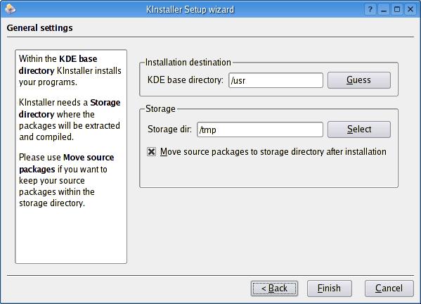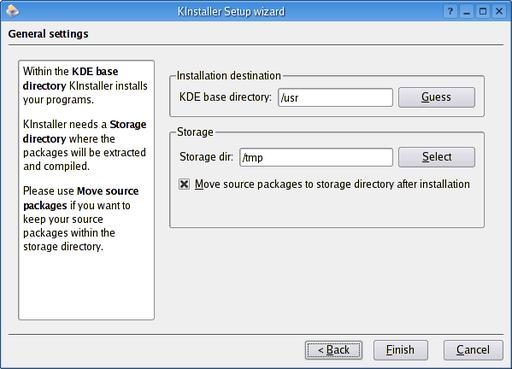 When you first start the program, you are treated to a setup wizard (Figure 1). Because this is essentially an installation tool for other KDE programs, your first step is to identify the KDE base directory. The easiest thing to do here is to click the Guess button. The field you should pay more attention to, however, is Storage dir. By default, KInstaller needs to know where you are going to extract and perform the installs for your packages. That directory is /tmp, but that may not be the best choice for everyone. Because I do a lot of package testing, I have a rather large partition, /mnt/bigdrive, that I use exclusively for this purpose. Choose something appropriate for your system. Finally, look at the check box labeled Move source packages to storage directory after installation. If you want to keep a copy of your source packages, check this box before continuing.