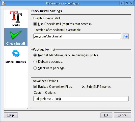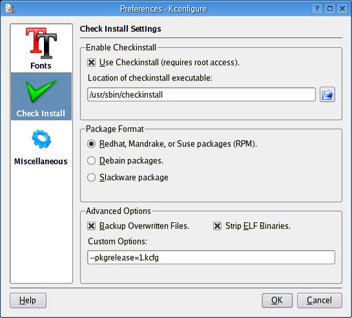 This is where things get interesting, so let's pause for a moment and look at KConfigure's configuration menu (Figure 3). I'll let you explore the Fonts and Miscellaneous settings on your own. For now, I want to concentrate on the Check Install Settings. To use the checkinstall program, click the Use Checkinstall check box and make sure you have the right path to the checkinstall executable (on my system, it resides in /usr/bin). I make a point of mentioning this since the default entered by KConfigure is /usr/sbin. When you are happy with your settings, click OK.