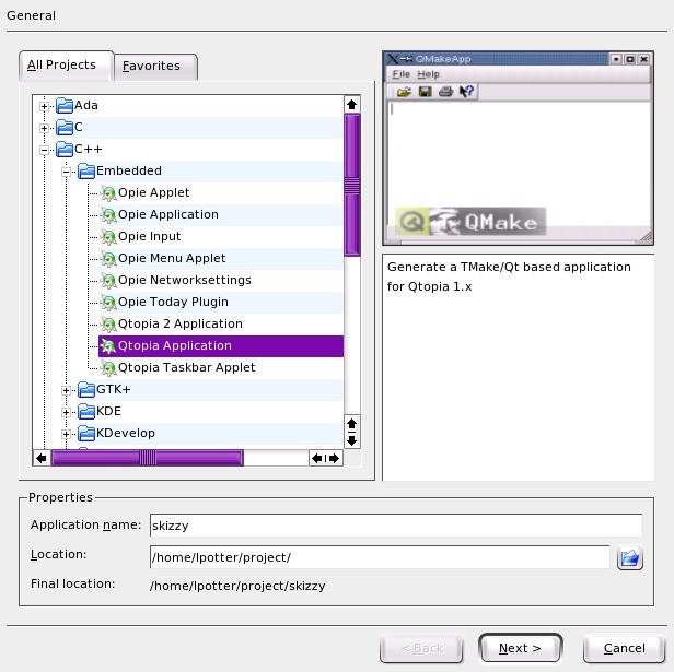 Start KDevelop, and from the Project menu choose New Project. Open the C++ directory icon, under the directory Embedded. Click the file called Qtopia Application to start a new Qtopia project. I could name this anything, like hippopotamus, but instead I will name my project skizzy. See Figure 1 for an example dialog for creating this project.
