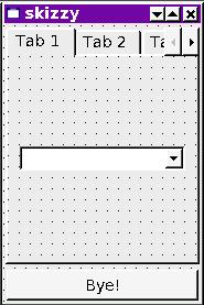 Start the Designer 2 application and open skizzybase.ui, and delete the QLabel. Add a QTabWidget with a QComboBox on the first tab, a QListBox on the second tab and a QMultiLineEdit on the third tab, for example (Figure 2).