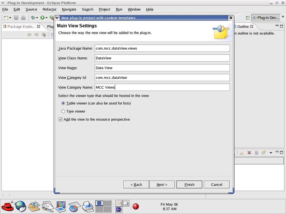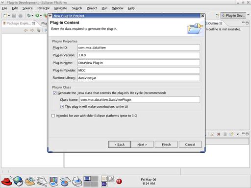 In the PDE, the Plugin Wizard allows a developer to create a sample plugin project quickly and easily, simply by selecting File→New→Plug-in Project. When prompted for a name of the plugin, we use a common syntax used by other commercial vendors. That is, we name the plugin with the text com.companyName.productName or in this example, com.mcc.dataView, as shown in Figure 1.