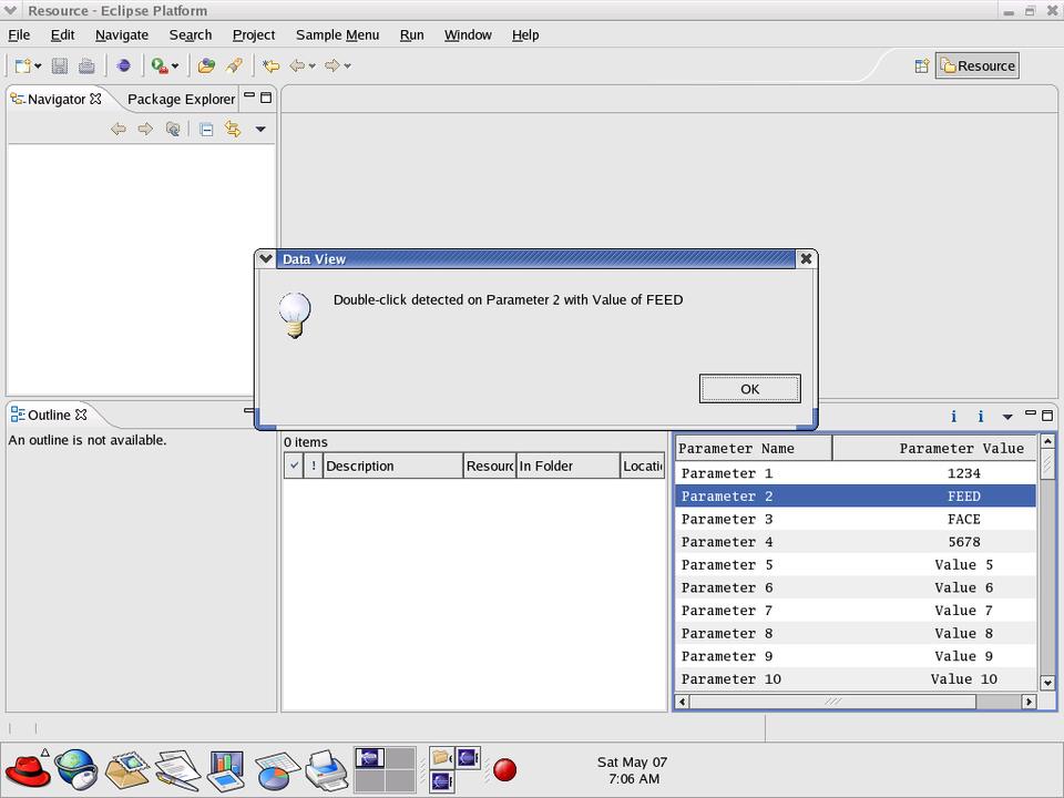 The final run-time workbench execution of the plugin is shown in Figure 3. In the figure, the user has double-clicked on an item, producing a simple user dialog that displays the actual data for the table selection made.