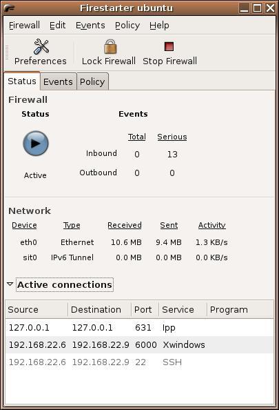The interface is simple with a three-tabbed view. The tabs are labeled Status, Events and Policy. The status view is the one you are most likely to be interested in on a regular basis. The display shows the firewall's run state (Active or Disabled), the inbound and outbound connections, as well as the traffic through your various interfaces. At the bottom of the window is an Active connections section that is closed by default. Click the arrow beside the label to view those connections.