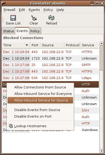 Right-click on one of these entries and a pop-up menu provides you with a number of options on dealing with these connections. For instance, if this is a port 80 (HTTP service) event, you may want to check Allow inbound Service for Everyone. You may feel differently, however, about a port 22 secure shell connection where you check only Allow inbound Service for Source. To allow a particular IP address (a PC on your internal network for instance), select Allow Connections From Source. You also can choose to stop logging connections either from a particular host or for a particular port number or service.