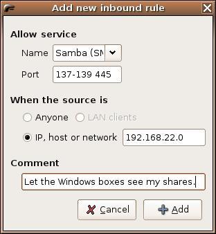 Let's add a rule to allow PCs on my local network to access the Samba service. At the top of the dialog is a drop-down list of possible services (for example, DHCP, BitTorrent, IMAP and so on). I select Samba (SMB) from the list. You will notice that for known services, the port (or ports) will be filled in automatically. Next, use the radio button under the When the source is label to allow everyone or a specific host or network. In this case, I'm adding my own class C network. Finally, I can choose to add some kind of comment in the field at the bottom. Click the Add button and that's it. The new rule appears in the Policy window. Click the Apply Policy button at the top of Firestarter's main window to apply your new policy.
