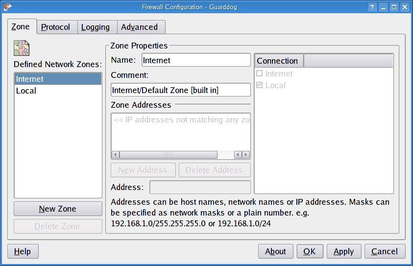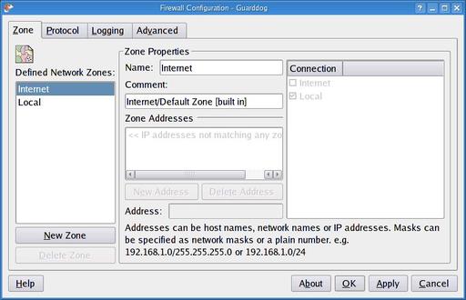 Guarddog's main interface consists of four tabbed windows labeled Zone, Protocol, Logging and Advanced (Figure 4). The Zone tab comes with two predefined zones. Local refers to traffic bound for the local address. Internet, on the other hand, is traffic leaving your system and bound for the Internet. This is very important. Guarddog makes it relatively easy to create complex firewalls using demilitarized zone (DMZ) configurations, multiple cards and so on. For now, let's concentrate on a basic desktop firewall configuration. That's one machine connected to the Internet.