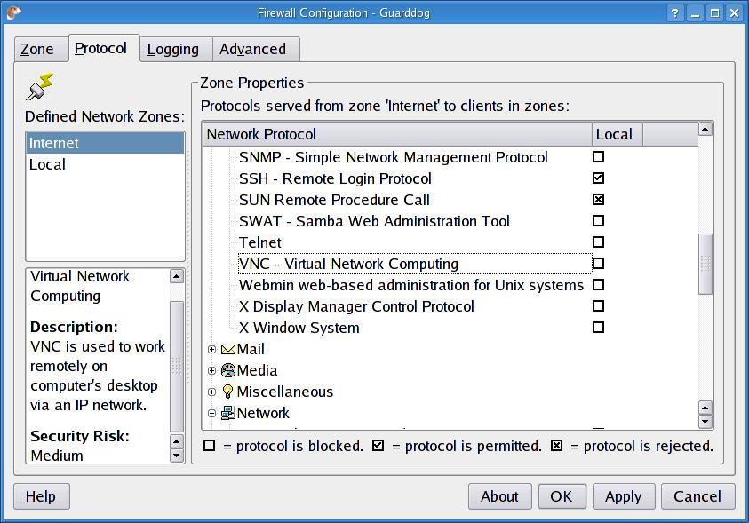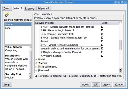 If you are running some kind of server (such as Samba file sharing), you can almost hear the cute little dog snarling, non? Perhaps you also run the secure shell (SSH), so that you can access this computer from another in your home or office. Click on the Local zone and select those protocols you serve. Remember, this is inbound traffic now, so you probably don't want to be quite as generous.