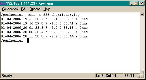 /perlserial: perl -w showtemp.pl 01-05-2006 14:43 34 F 1.3 C 30.52 k Ohms
