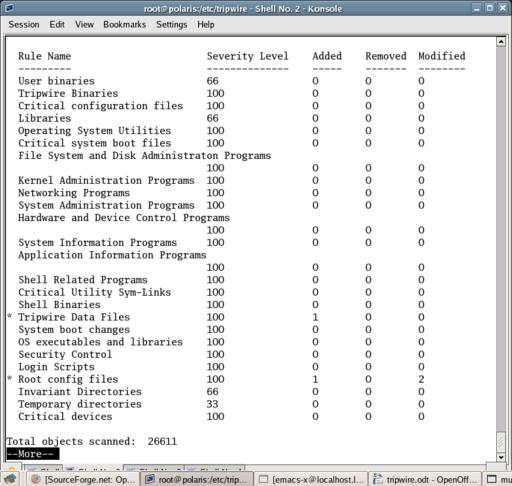 Figure 1 shows an example of what a Tripwire report looks like. It tells you, for every rule defined in the policy, which of the corresponding files were added, changed or modified. Command-line options are available to check only specific sections of the policy file, or just some files. This could be useful, for example, when nothing was modified in the system, but there is the suspicion that some particular disc or partition was damaged.