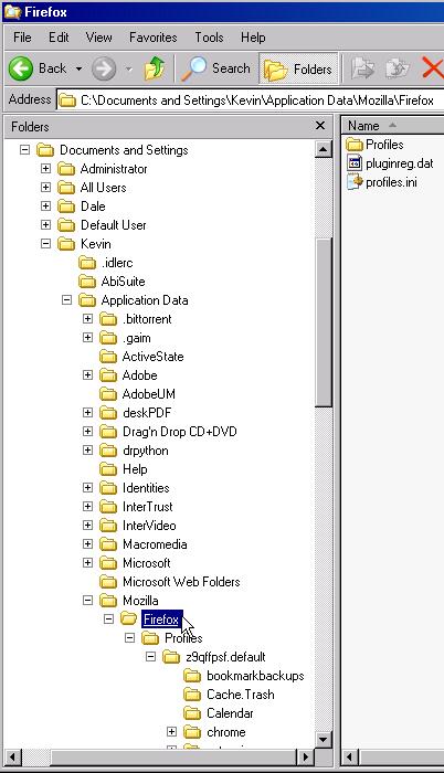 My Windows Firefox installation contained all my personal bookmarks and other configuration settings, so I reconfigured that Firefox first. In Windows, find the Application Data directory for your user name beneath the Documents and Settings directory. You should see a directory named Firefox that has a subdirectory named Profiles. The Profiles directory will have at least one subfolder. Here's how it looks on my system:
