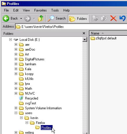 To make my configuration data available to both operating systems, I made a Firefox\Profiles directory beneath my shared E:\users\kevin directory, then copied the original Firefox Profiles\z9qffpsf.default configuration directory to that path. Figure 2 shows the result.
