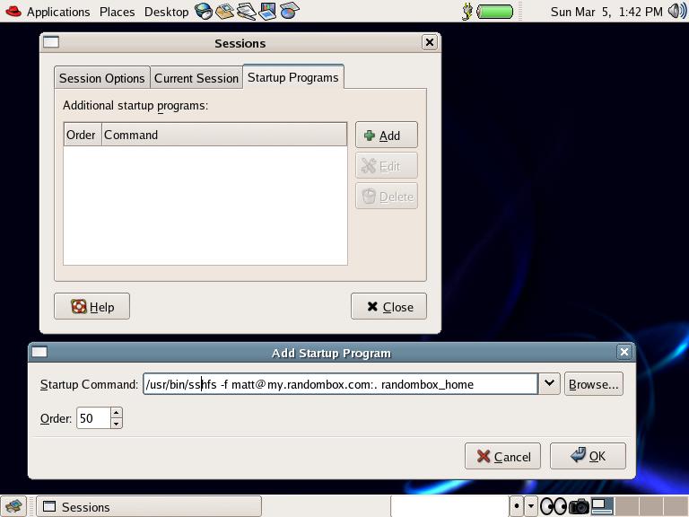 In the last example, we configured and automated non-interactive mounting of a remote directory. Because we're no longer being prompted for a password, we can integrate SSHFS mounting into scripts, or better yet the GNOME desktop. To configure GNOME to mount our remote home directory automatically, we configure the SSHFS mount command as a session startup program. This is done from inside the Sessions preferences dialog. Navigate to Desktop→Preferences→More Preferences→Sessions->Add, and fill in the dialog as shown in Figure 1.