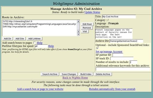 Figure 2. The Manage Archive page lets you combine Web pages from different sources into one searchable index.