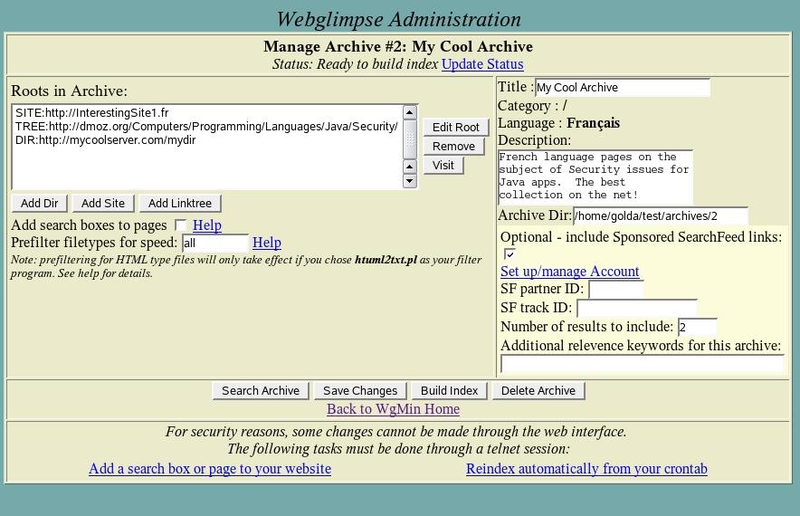 So, now you have a searchable archive of your chosen sites, the coolest collection of links anywhere on your particular subject. Users everywhere can take advantage of your research and use your server to search through your highly optimized index. If you want, you now can serve ads in order to generate revenue and support your site. Back on the Manage Archive screen shown in Figure 2, check the box labeled Optional - include Sponsored SearchFeed links. Then, click on Set up/manage Account, which is a link to set up an account with Searchfeed.com. An on-line advertising and content provider company, Searchfeed.com provides sponsored search results that are supposed to be relevant to the keywords on which the user searches. Once your account is set up, simply enter the partner ID and track ID provided by Searchfeed.com and choose how many ads should appear at the top of your search results. It's pretty simple to set up. To get the most out of your ads, you can use the suite of on-line tools provided by Searchfeed.com to monitor what keywords users are searching on, which ads they are clicking on and how much you make from each click.