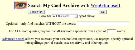 You also can get the same forms by pressing the Search this Archive button or entering the URL directly to the Webglimpse cgi (http://mycoolserver.com/cgi-bin/wg2/webglimpse.cgi?ID=2). Normally they are generated in the language of the archive, but we're showing them in English here.