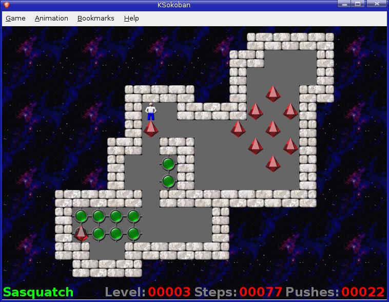 Complexity in KSokoban comes with successive levels. There also are collections of levels, and even those collections vary in terms of complexity. If you find yourself overwhelmed, or if you would like a kinder, gentler version of KSokoban that your younger kids can enjoy, click Game on the menu bar and select Microban (easy) from the level collection. It's a great way to build up your confidence before submitting yourself to the Sasquatch levels.
