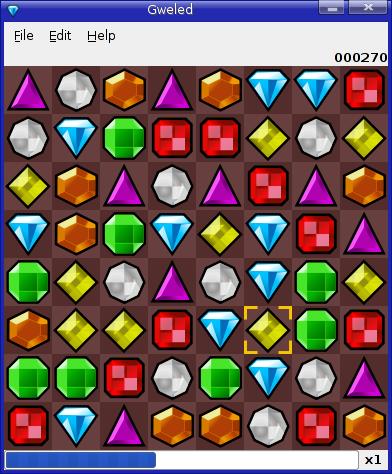 Sebastien Delestaing's Gweled is a Linux port/remake of a game called Diamond Mine, also known as Bejeweled. This gem of a game features an array of precious stones from diamonds to emeralds to rubies and more (Figure 2). The idea is to line three identical stones in a row (diagonally does not work). Your only method for accomplishing this feat is to click on a stone and then another adjacent stone. This causes the stones to flip their position. This works only if the flip generates a three-in-a-row combination. Once three stones line up, those above fall and the grid is replenished. The object is to play until there are no further moves and, of course, to generate the highest possible score in that time frame.