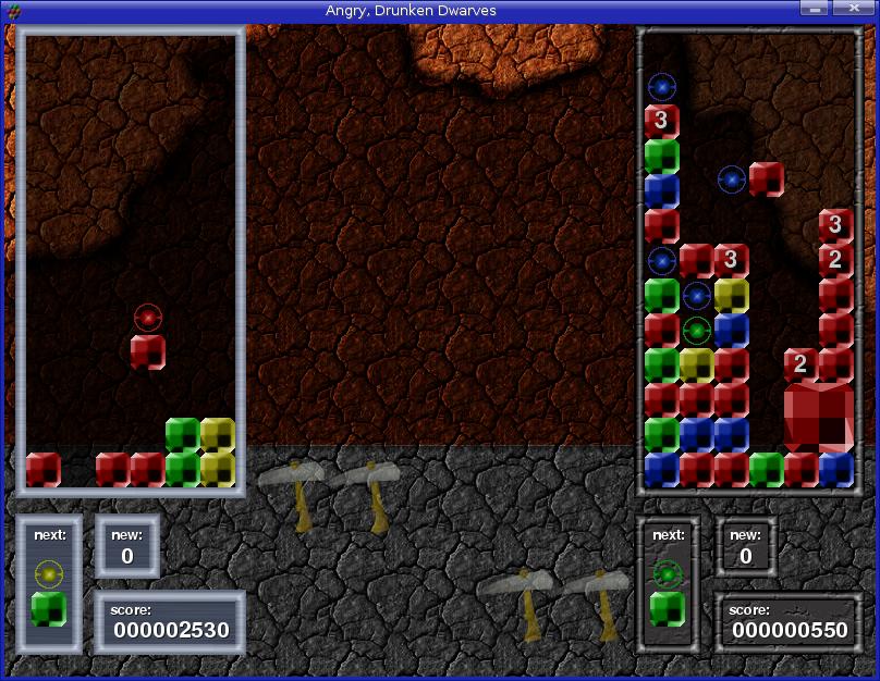 During the course of the game, colored gems drop slowly from above (gravity must not be as strong deep underground). As they drop, you use the cursor keys—or the keyboard in a multiplayer game—to rotate and position the gems. This is more than just a Tetris clone. Angry, Drunken, Dwarves is also a strategy game. Assemble the falling gems in a rectangular combination, and the gems will fuse into larger gems, or crystals. Circular, star-like gems are called break gems when they hit a gem (or crystal) of the same color. Crystals, as you might expect, are worth more than gems when smashed by a break gem.