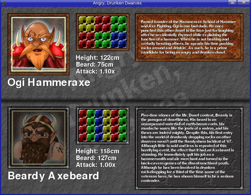 Figure 8. Each angry, drunken, dwarf comes with his own picture, attack pattern and bio.