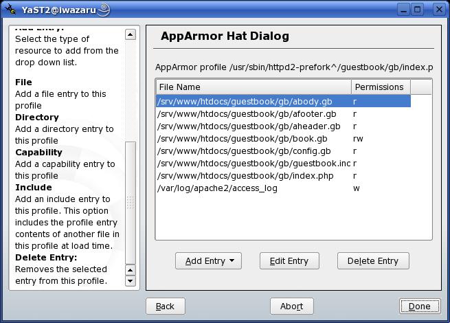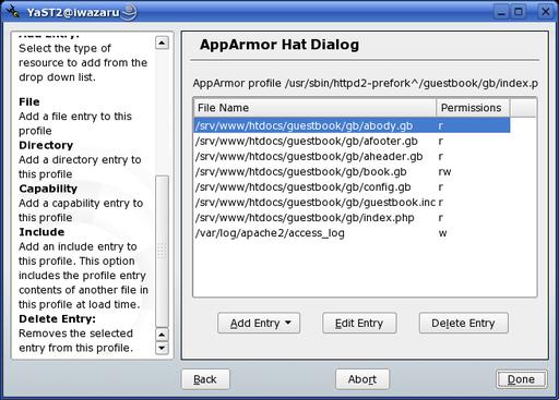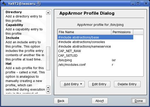 AppArmor is therefore only a partial implementation of mandatory access controls. But on networked systems, application security is arguably the single-most important area of concern, and that's what AppArmor zeros in on. What's more, AppArmor provides application security through an easy-to-use graphical user interface that is fully integrated with YaST. (GUI tools are now being developed for SELinux as well, but just how easy to use these are is open to debate.)