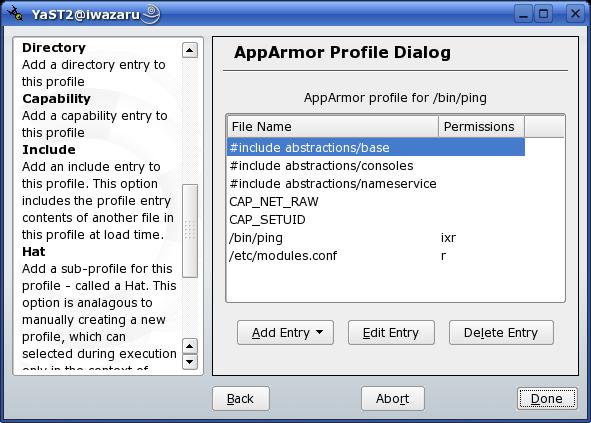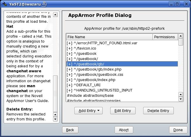 Also, I should point out that, just like all of YaST's modules, you don't need to be running the X Window System to run the Novell AppArmor YaST applets. You shouldn't be running X on Internet-connected servers, both because it's almost never necessary and because X has a very rich history of so-called local privilege escalation vulnerabilities. It may seem tempting to ignore such vulnerabilities if you're worried about non-local attackers, but “local” is a usually a misnomer. If attackers gain shell access via, for example, a buffer-overflow attack against some network dæmon, they often can exploit so-called local privilege escalation vulnerabilities to promote themselves to root.