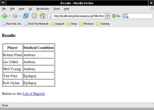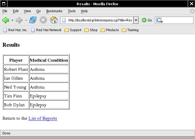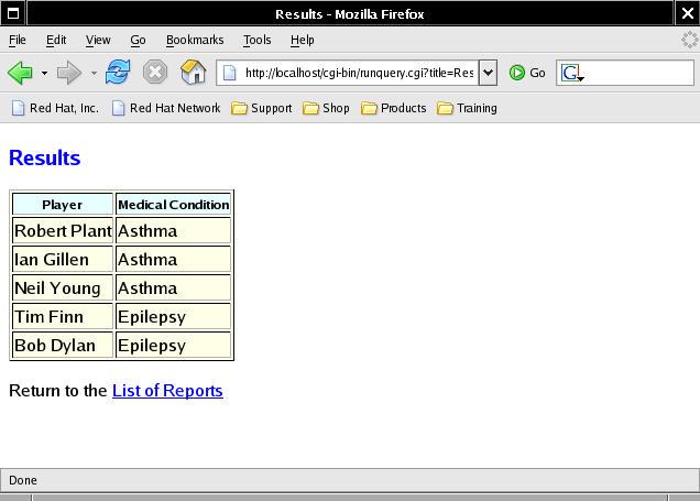 The above SQL query joins the player and condition tables in order to list the names of each player together with his medical condition, assuming he has one. This query file also needs to be copied to the CGI directory on the Web server: