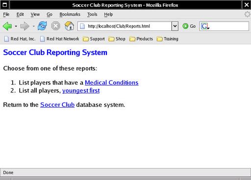 As shown above, each report is executed with two parameters: title, which provides a report description, and query, which identifies the SQL query file to run through MySQL. With my Web page created, I copied it into the root directory of the Soccer Club Web site: