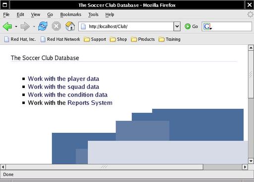 To link my simple reporting interface into my Soccer Club application, I changed the custom/frontpage template to include an additional list item that refers to the reporting Web page: