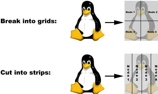 Applying a filter to an image can take minutes or even hours to complete, depending on the complexity of the filter, the size of the image and the speed of the computer. To fix these problems, we need to get smaller chunks of the image to several computers to help speed up the task. Figure 1 shows common ways of doing this—we'll cut our image into strips. If we have one large image file, we can do this in C/C++, like this: