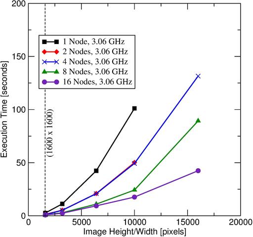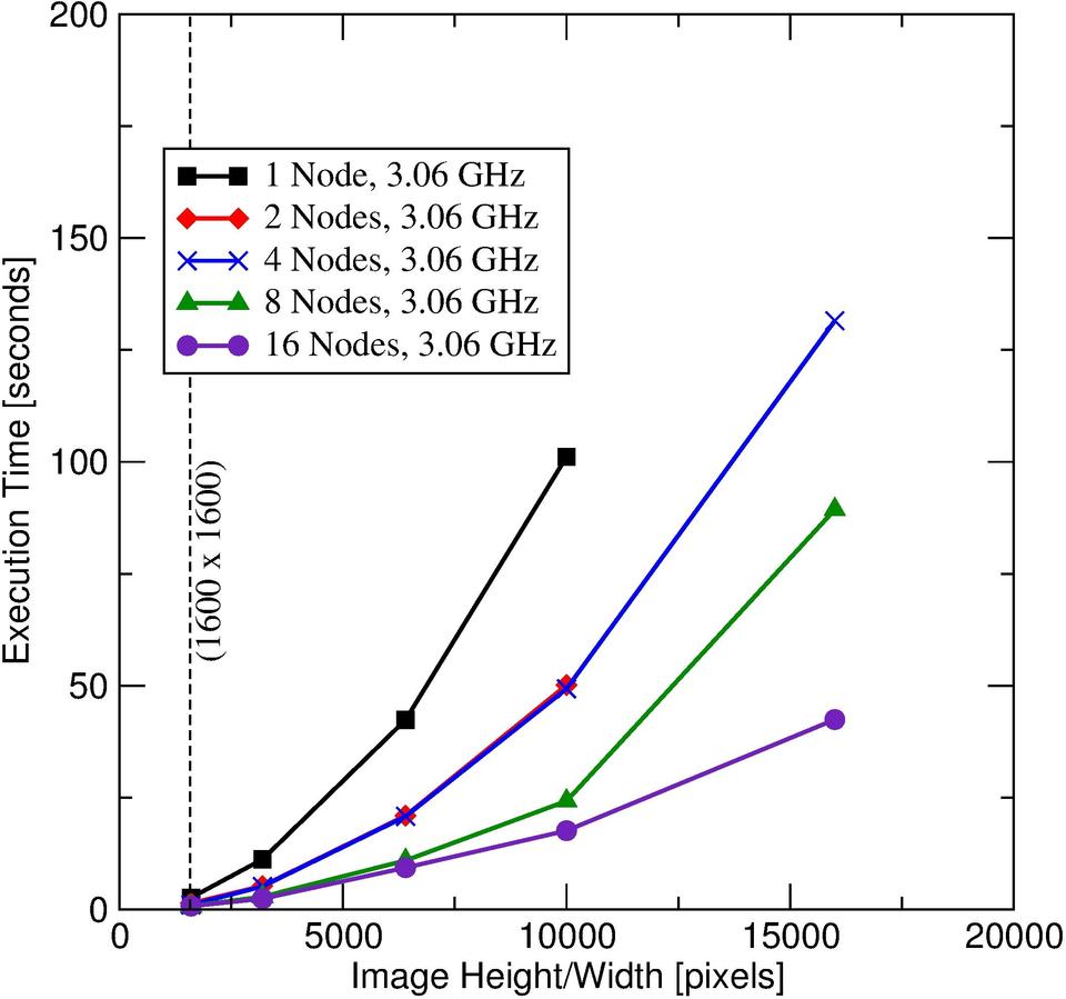 Figure 4. Shown here are the times that the program took for various image sizes and various cluster sizes. Image sizes ranged from 1,600 x 1,600 pixels to 16,000 x 16,000 pixels. A minimum of four nodes was required for the largest image.