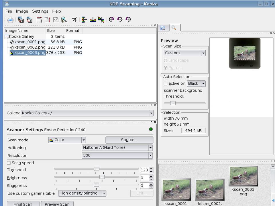 Scanning a color photograph entails selecting a Scan mode of color and the appropriate resolution. The Source item also may need to be selected (for instance, I use a Epson 1240U that has the choice of a flatbed scanner or transparency unit). Select Preview Scan. This generates an image in the preview box to the right. It is then possible to use your mouse to select the portion of the preview that you want to scan. Select Final Scan. At the end of the scanning process, a dialog box pops up, asking you in which format to save the scanned image. Saving the image creates a thumbnail image in the box at the bottom right and adds the image to the Kooka Gallery at the top left. For further work with an image, select the Image menu item and then Open Graphic Application to use the image editor you prefer.