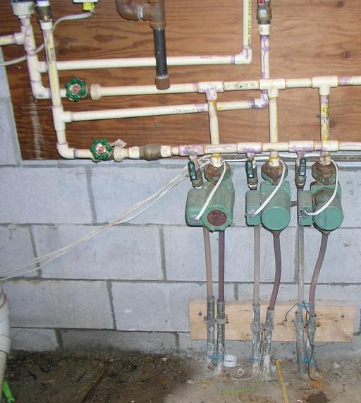 Another component is the circulator(s). Water must be persuaded to flow through the system. The norm is that at least one pump or circulator is required. Circulation systems can be designed in a number of ways. I have been able to procure small circulators very cost effectively (cheaply), so I have used a circulator for each zone. This significantly simplifies many other aspects of the design of the system. It eliminates the need for zone control solenoids and their controls. It eliminates controls for the circulator separate from those of the zone. It makes providing a zone-by-zone failsafe override easier, and it reduces the need to balance the system.