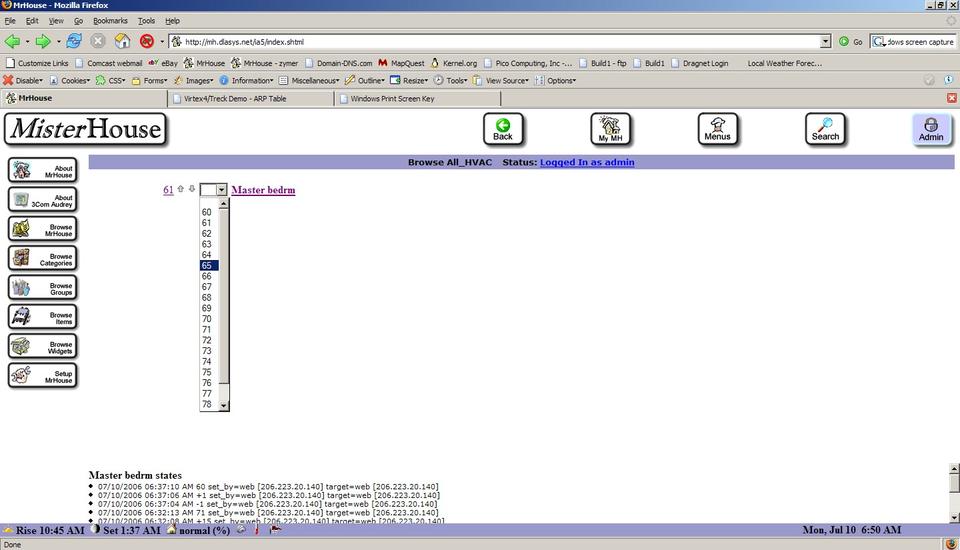 This would create an HVAC_Zone object named master_bedrm in groups All_HVAC and Thermostats, with a setpoint of 72 and a delta of +/– 2°. A few minor alterations to the MisterHouse Web server were necessary to create a Web control that is displayed for each zone. I used the X10 Lamp item as a reference, as it already had a drop-down as well as arrow buttons for relative changes.