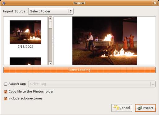 After installing F-Spot, the first task is importing existing photos. Choose import from the File menu and then Select Folder from the Import Source drop-down menu. This brings up a file selection dialog. Navigate to the folder where you have been keeping all of your photos, and click Open.